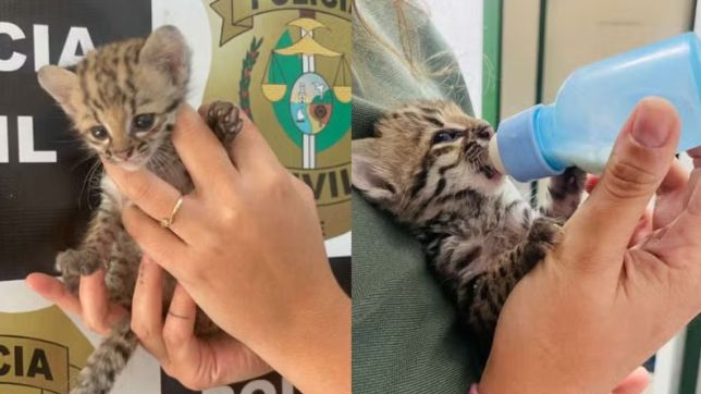 Animal silvestre ameaçado de extinção, um gato-do-mato filhote foi resgato em uma residência em Fortaleza. Dois homens foram presos durante a ação, após uma denúncia anônima sobre a venda do animal pela internet.