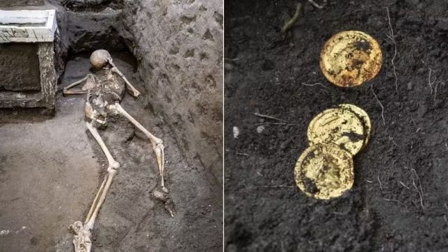 Os corpos cobertos de cinzas foram encontrados "presos" numa sala. Acredita-se que eles estavam tentando se abrigar quando morreram. Ao lado do esqueleto da mulher, os arqueólogos descobriram um "tesouro de itens valiosos", incluindo brincos de ouro e pérolas e uma coleção de moedas de ouro, prata e bronze.