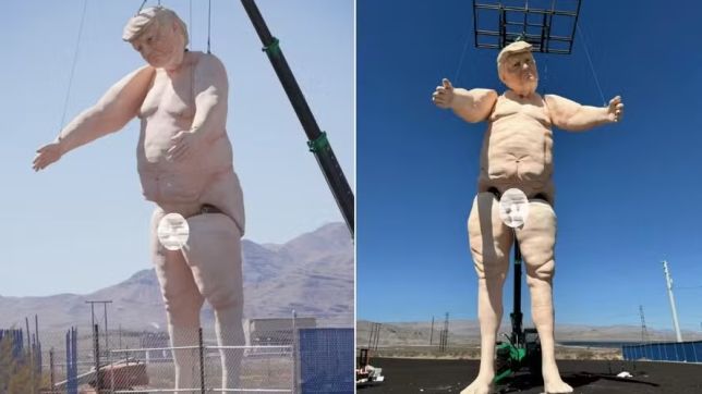 Foi inaugurada no fim de semana, em Las Vegas (Nevada, EUA), um estátua gigantesca de Donald Trump pelado. A escultura de 13 metros de altura (mais que um prédio de quatro andares) é feita de espuma sobre vergalhões e pesa 2,7 toneladas.