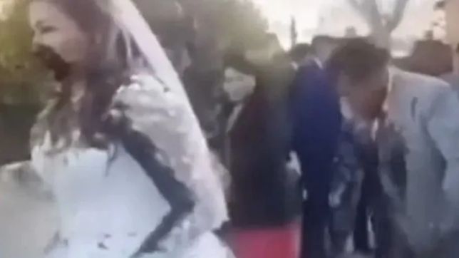 As fezes com azeite acertaram em cheio a noiva, que ficou com a mistura até na boca. O noivo, que logo vinha atrás, foi atingido por menor quantidade, mas ficou com o terno bem prejudicado. Convidados também acabaram salpicados.
