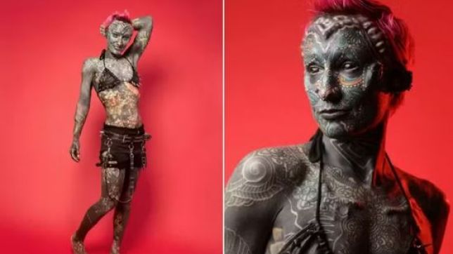 Esperance Lumineska Fuerzina se tornou oficialmente a mulher mais tatuada e a mulher com mais modificações corporais da História como parte de um projeto de uma década que a viu tatuar seus globos oculares e injetar implantes semelhantes a escamas no couro cabeludo.