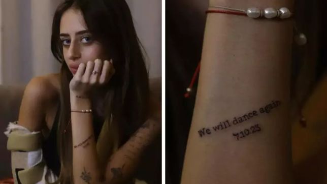 A tatuagem diz “vamos dançar novamente” e tem a data “7.10.23”, o dia do início do conflito entre Israel e o Hamas. Mia é franco-israelense, e foi sequestrada naquele dia, e libertada durante o acordo de cessar-fogo temporário.