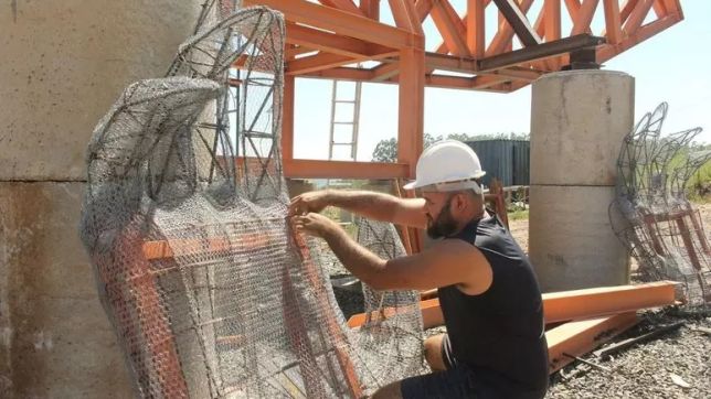 "Depois que eu encaixo na proporção sobre o tamanho que o cliente quer, começo a construção no ferro. Entorto tudo manualmente, moldando, e minha equipe fecha com ferros menores, reveste de tela e depois com camadas de massa. São quatro camadas de cimento com 10 centímetros de espessura", explica.