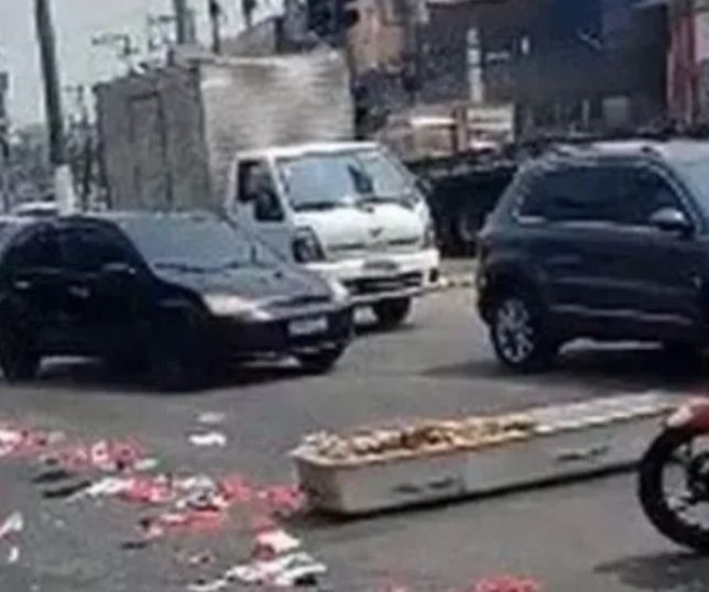 Caixão com corpo dentro cai de carro de funerária em avenida