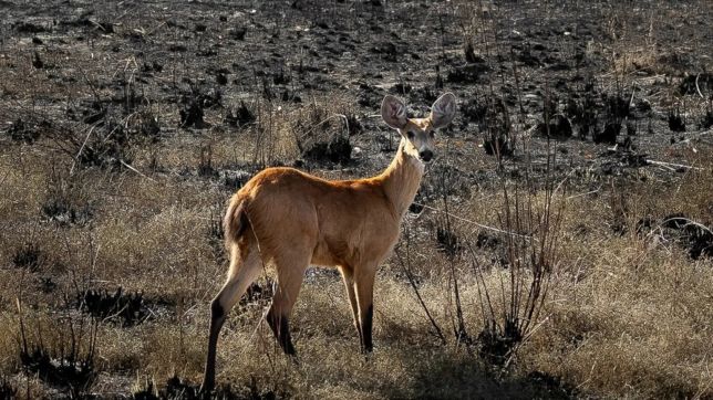 Fêmea de cervo-do-pantanal (Blastoceros dichotomus) caminha por área afetada pelo fogo no bioma
