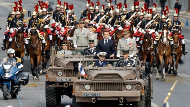 Antes do desfile, o chefe de Estado francês percorreu a avenida rumo ao Arco do Triunfo a bordo de uma viatura militar, sob aplausos e algumas vaias do público.