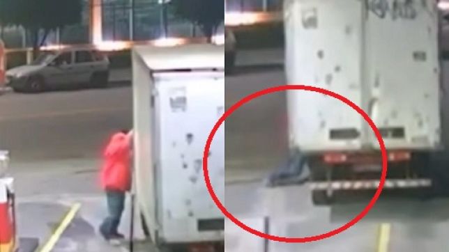 Câmeras de segurança mostram o momento em que o condutor acelera e derruba o frentista, que tenta se segurar na porta do caminhão.