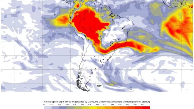Modelos de previsão de dispersão de aerossóis, como o europeu CAMS do Sistema Copernicus, indicam que um denso corredor de fumaça está se movendo para o Sul.