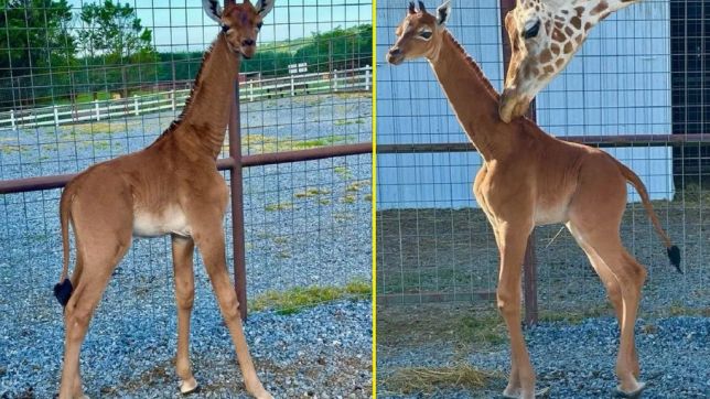 Internautas estão fascinados com um filhote raríssimo de girafa que nasceu no zoológico Bright’s Zoo, em Limestone, no Tennessee (EUA). Ele não possui as famosas manchas (retículas) que definem a espécie africana.