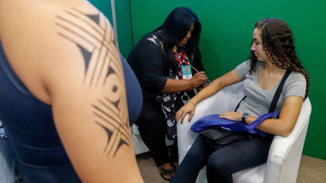 A pintura corporal com grafismos indígenas, aplicados pela artista, professora e compositora Thaís Kokama, é atração especial no estande da Prefeitura de Manaus , por meio da Fundação Municipal de Cultura, Turismo e Eventos (Manauscult), durante a “WTM Latin America 2023”, a maior feira da indústria de viagens e turismo da América Latina, que acontece a partir desta segunda-feira, 3/4, no Expo Center Norte, em São Paulo (SP).