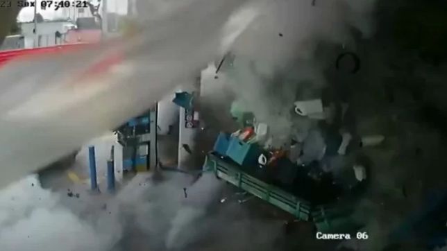O impacto danificou o veículo e partes do posto de gasolina. Ninguém ficou ferido.