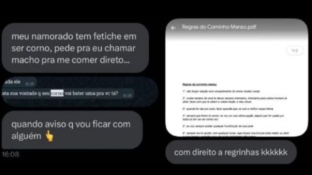 “Pede para eu chamar macho para me comer direto”, confidenciou. Além disso, a internauta enviou um documento que chamou a atenção dos seguidores da página: o print de um PDF com o título “regras do corninho manso”.