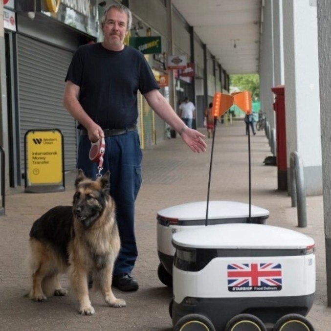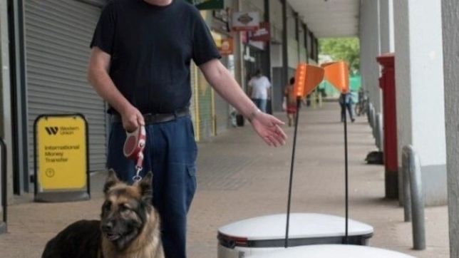 Brian Dawson — um britânico de 56 anos que mora em Milton Keynes, perto de Londres —, conta que passeava com a pastor alemão, chamada Pippa, dele quando viu a aproximação do robô de delivery de compras.