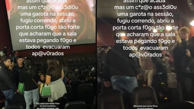 Ela também deixou um alerta para outras garotas que possam ver o post. “Ele sabia que nesse filme só teriam mulheres. Se cuidem, meninas, não estamos seguras em lugar nenhum”, disse. No vídeo, é possível ver o filme rodando ao fundo mesmo com as pessoas de pé andando pela sala.