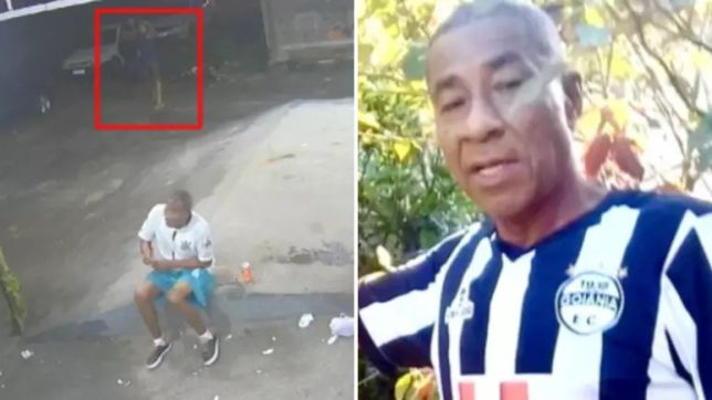 As imagens mostram o idoso sentado na calçada, tomando um refrigerante e com uma cartilha de palavras cruzadas na mão. Ao fundo, dois jovens conversam, quando outros dois passam pela rua e os encaram.