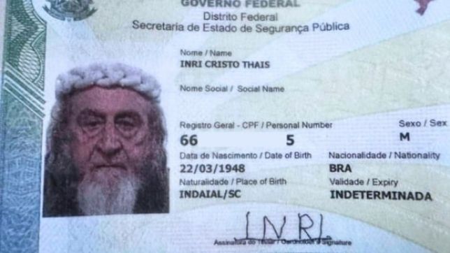 Na nova carteira de identidade, o líder religioso assina como “Inri” e aparece com uma coroa de espinhos de plástico na foto três por quatro. Como ele tem mais de 65 anos, o documento não possui prazo para expirar.A lei federal 14.382 libera a troca de nome direto no cartório, sem ação judicial. Antes, era necessário contratar advogado, apresentar uma justificativa plausível e esperar a decisão do juiz, que poderia negar o pleito.
