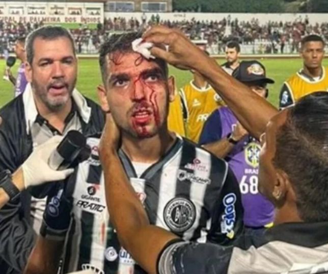 Jogador sai de campo sangrando após ser atingido por lata na cabeça