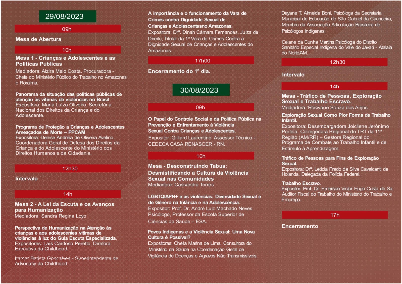 A secretária nacional dos Direitos da Criança e do Adolescente, Maria Luíza Oliveira, é mais uma presença confirmada. Ela ministrará uma palestra com o tema "Panorama da situação das políticas públicas de atenção às vítimas de violências no Brasil". A coordenadora geral de
