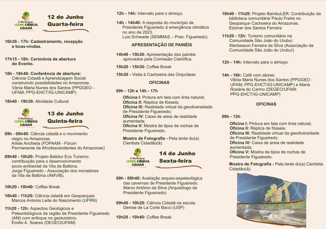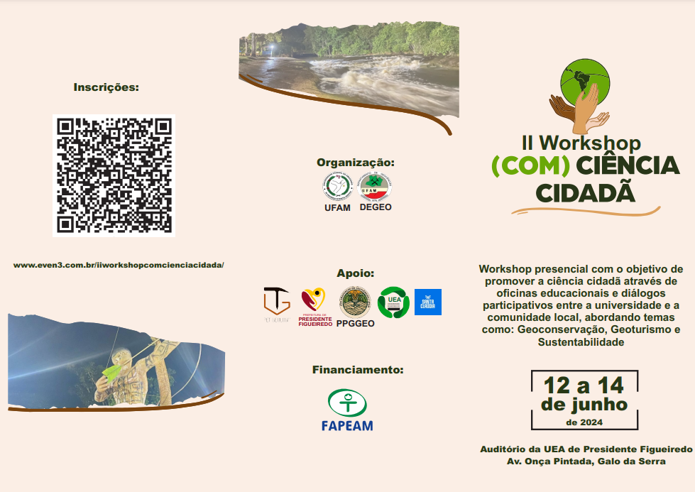 O Departamento de Geociências (DEGEO) da Universidade Federal do Amazonas (UFAM) tem o prazer de anunciar o II Workshop (Com) Ciência Cidadã no Amazonas, que ocorrerá de 12 a 14 de junho de 2024, na cidade de Presidente Figueiredo - AM, conhecida como a Terra das Cachoeiras.