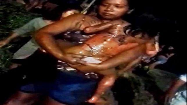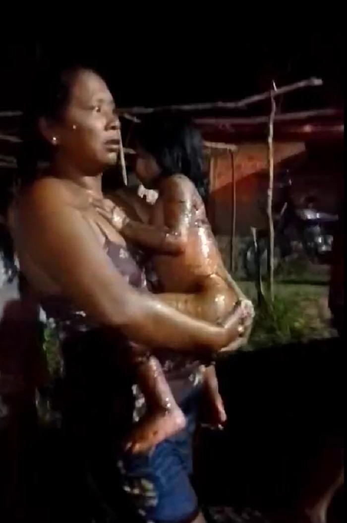 Mãe carrega a menina indígena no colo após após salvar criança de morrer queimada