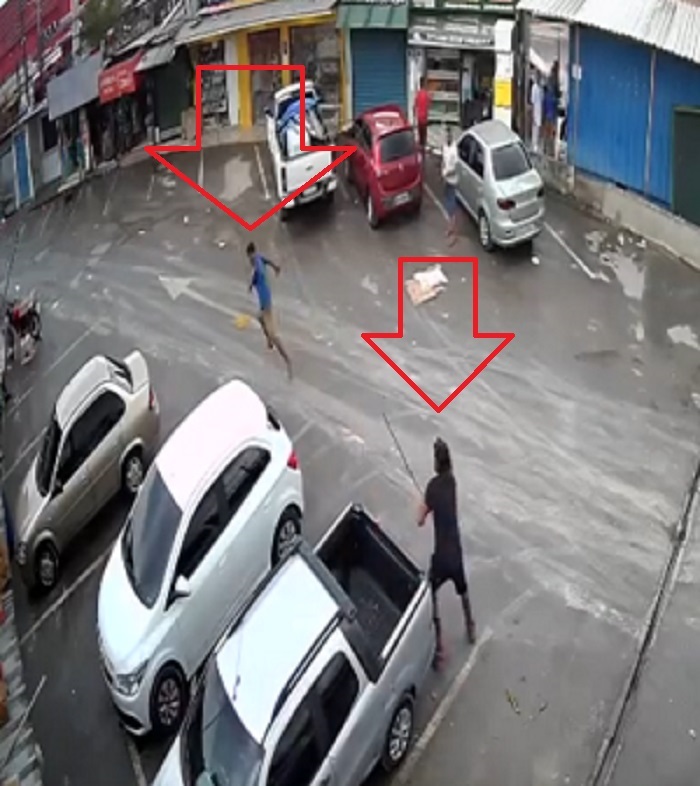 Mesmo ferido o homem ainda tenta reagir pegando um pedaço de madeira e dá alguns paços na direção do agressor, mas começa a sentir os efeitos da gravidade do golpe de e desiste da perseguição.