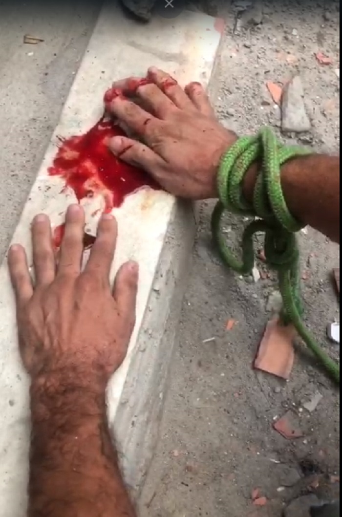 Depois que os dedos da mão direita são decepados pelos golpes de terçado, o ladrão é obrigado a botar a mão direita em cima de uma coluna de cimento, para ser reiniciado o castigo perverso e nas imagens se vê claramente, os dedos sendo separados das mãos da vítima.