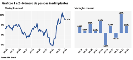 O número de brasileiros inadimplentes cresceu 7,7% em janeiro, na comparação com o mesmo período do ano passado, e representa pouco mais de 65 milhões de brasileiros. Em relação a dezembro, o dado corresponde a um aumento de 0,56% na quantidade de pessoas com as contas em atraso. Os dados foram divulgados na manhã desta quinta-feira (16), com base em levantamento feito pelo SPC (Serviço de Proteção ao Crédito) e pela CNDL (Confederação Nacional de Dirigentes Lojistas), com informações de capitais e interior dos 26 estados e do Distrito Federal.