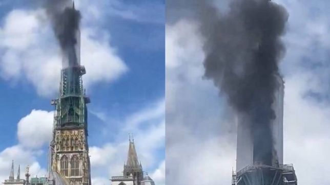 Fumaça sai da agulha da catedral de Notre Dame de