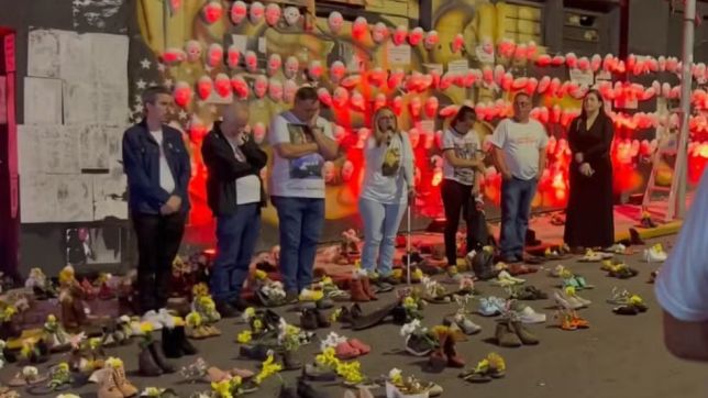 Em frente ao prédio foram colocados 242 pares de sapatos para representar todas as pessoas que morreram em decorrência do incêndio.