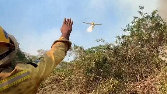 Na região do Pantanal do Nabileque, próximo a BR-262, o Corpo de Bombeiros atua para impedir que as chamas cheguem ao Parque Estadual do Pantanal do Rio Negro, que já queimou em anos anteriores.