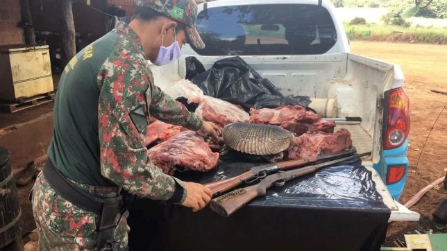 A Polícia Militar Ambiental de Bonito prendeu e autuou dois homens por caça ilegal de animais silvestres e porte ilegal de armas. Os policiais apreenderam 52 quilos de carne de catetos (Pecari tacaju), 3kg de carne de cutia (Dasyprocta punctata) e um tatu-galinha (Dasypus novemcinctus) — espécie ameaçada de extinção –, armazenados em um freezer no local, além de dois rifles e munições.