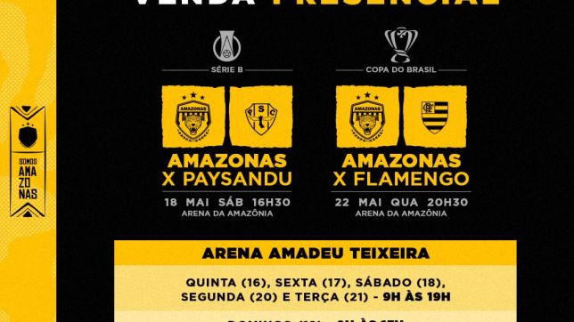 O Amazonas FC divulgou, nesta quarta-feira (15), o início da venda de ingressos no formato presencial para os duelos diante de Paysandu-PA (sexta rodada da Série B) e Flamengo-RJ (terceira fase da Copa do Brasil) a partir das 9h desta quinta-feira (16), na Arena Amadeu Teixeira.