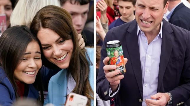 A princesa de Gales esbanjou simpatia ao lidar com as pessoas que aguardam o show deste domingo (7) próximo a Windsor; Príncipe William se divertiu com lata de bebida especial para o evento