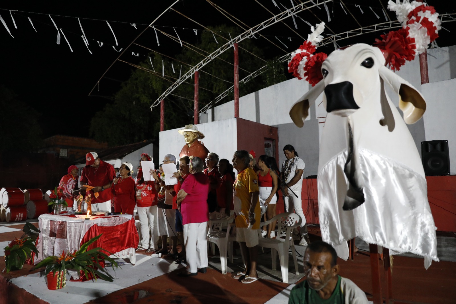 No curral do Garantido, na Rua Lindolfo Monteverde, torcedores do boi se reúnem em um ato que converge com a identidade cultural da agremiação folclórica.