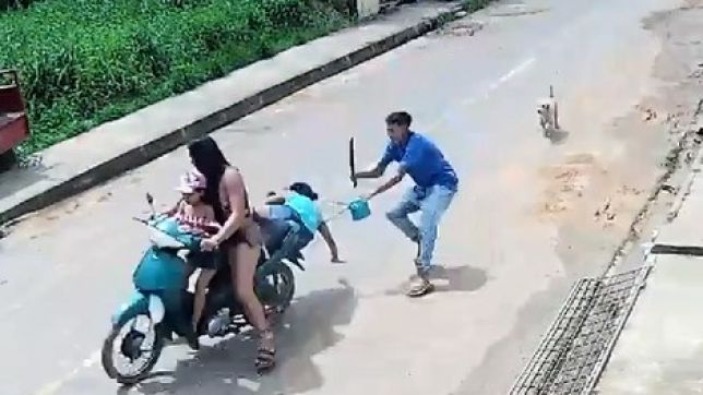 No veículo, estavam duas mulheres e duas crianças. A motociclista não para e o homem puxa a passageira, que estava com um bebê no colo. A mulher cai com a criança e o criminoso rouba a bolsa da vítima, ameaçando-a o tempo inteiro com um terçado. Em seguida, ele foge correndo.
