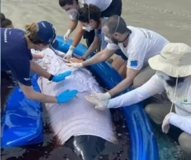 Baleia de 3,6 metros é resgatada após encalhar em praia de Santa Catarina