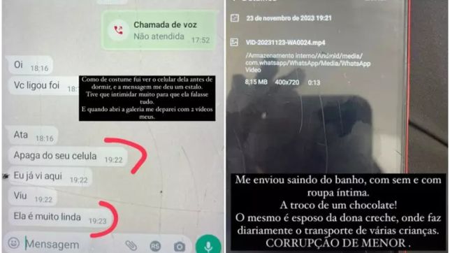 A mãe da menina também afirmou na postagem que contou à esposa do motorista o ocorrido, mas ouviu da mulher que tudo se tratava de "um mal entendido", mesmo após ela mostrar os prints da conversa e os vídeos que encontrou no celular da filha. A criança teria enviado imagens da mãe saindo do banho.