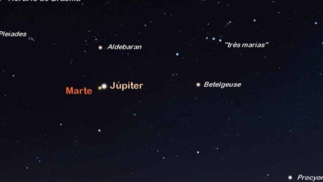 Segundo o Observatório Nacional, Júpiter e Marte poderão ser vistos a menos de um grau até sexta-feira, parecendo quase se tocarem no céu — uma impressão visual resultante de um raro alinhamento planetário. Embora Marte e Júpiter aproximem-se um do outro, no céu, a cada 825 dias, a próxima vez que eles estarão aparentemente tão próximos, será em dezembro de 2033.