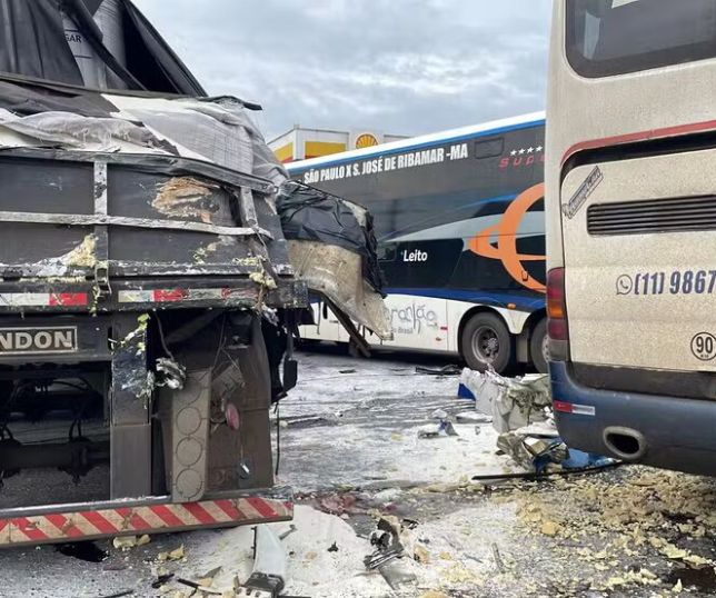 Ônibus invade posto de combustíveis, bate em caminhão estacionado e deixa 14 pessoas feridas