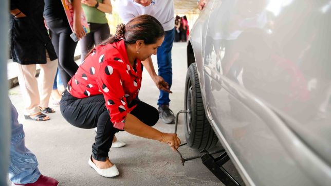 Já no último sábado, ficou marcado pela aula prática, onde foi ensinado como trocar o pneu, onde posicionar de forma correta o triângulo de sinalização do veículo, além de identificar as luzes no painel do veículo.
