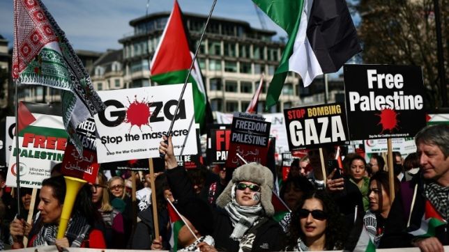 Manifestantes pró-palestinos protestam nas ruas de Londres, capital do Reino Unido, em 9 de março de 2024 - AFP