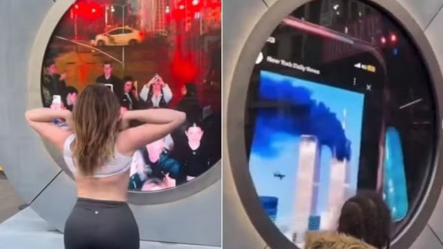 A modelo que causou polêmica ao mostrar os seios no portal que une Nova York (EUA) a Dublin (Irlanda) em tempo real se autodenominou "uma heroína" e disse que cometeu o ato como vingança por uma piada sombria sobre o 11 de Setembro.