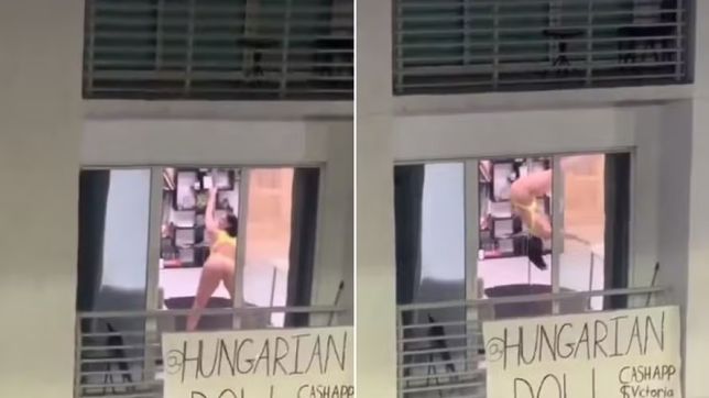 No vídeo, Victoria, usando apenas um maiô amarelo bem cavado, faz manobras num pole dancing, a sua especialidade no universo de conteúdo adulto, também explorada nas suas redes sociais. Num cartaz preso na grade da varanda, ela exibiu os detalhes da sua conta para ganhar assinantes.