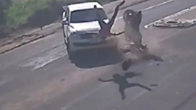 O motociclista colidiu com a lateral do veículo e foi arremessado por cima do capô da caminhonete.