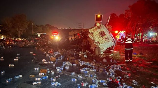 Imagens registradas após o acidente mostram a carreta destruída e a carga espalhada pelas pistas da rodovia.