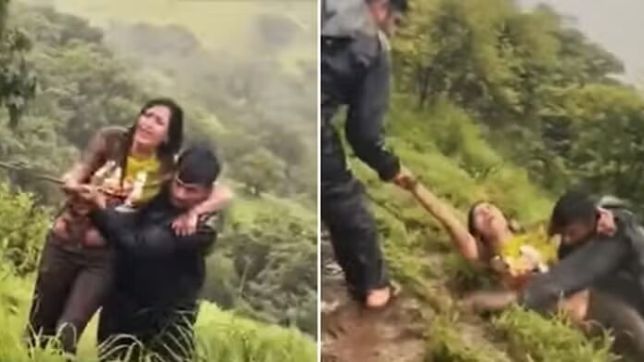 Um vídeo mostra como um socorrista a conduziu por uma corda em meio a um tempo chuvoso. Nasreen gritava de dor e parecia traumatizada ao chegar perto do topo da encosta íngreme. Foi quando suas pernas fraquejaram e a indiana caiu.