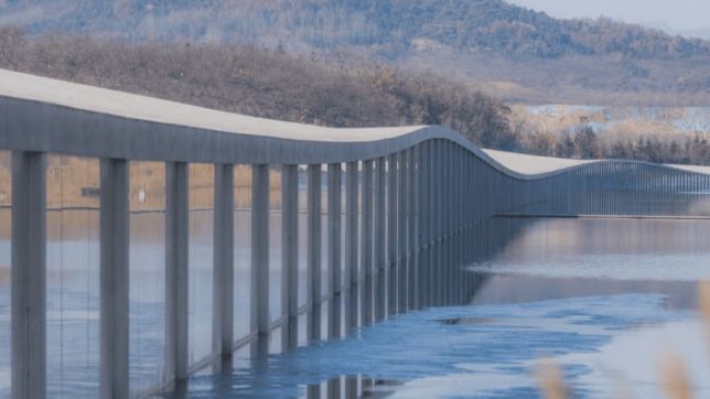 A China inaugurou recentemente um museu com 1 quilômetro de extensão, cercado pela água de um lago artificial e com uma arquitetura que imita as curvas das ondas do mar.