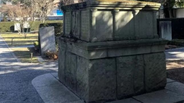 Mas o monumento de pedra de 13 toneladas que supera as lápides próximas está causando polêmica e constrangimento agora.