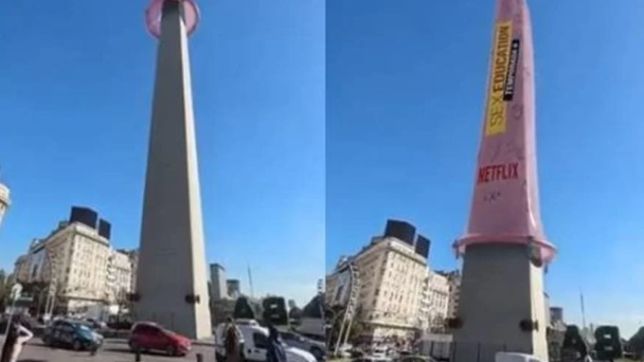 O obelisco de Buenos Aires foi coberto com uma camisinha gigante e cor-de-rosa para a divulgação de Sex Education, da Netflix