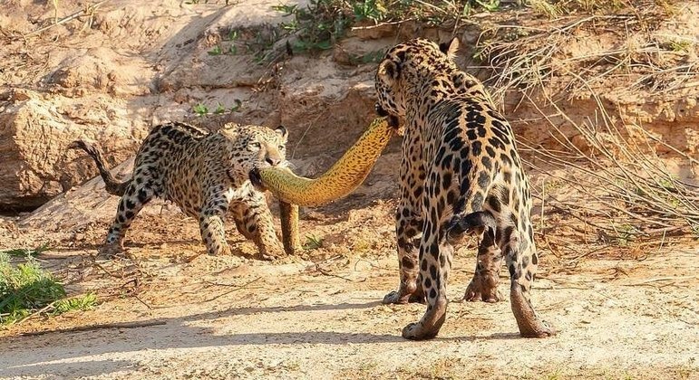 Mesmo sendo uma caçadora temida e imensa, a sucuri não foi páreo para uma família dos felinos reis da fauna brasileira.